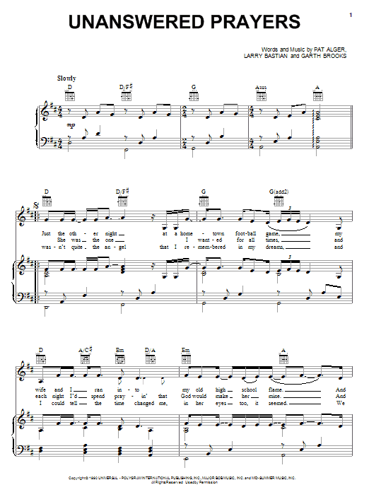 Download or print Garth Brooks Unanswered Prayers sheet music, chords and digital score arranged for Piano, Vocal & Guitar Chords (Right-Hand Melody). This Country score includes 6 page(s).