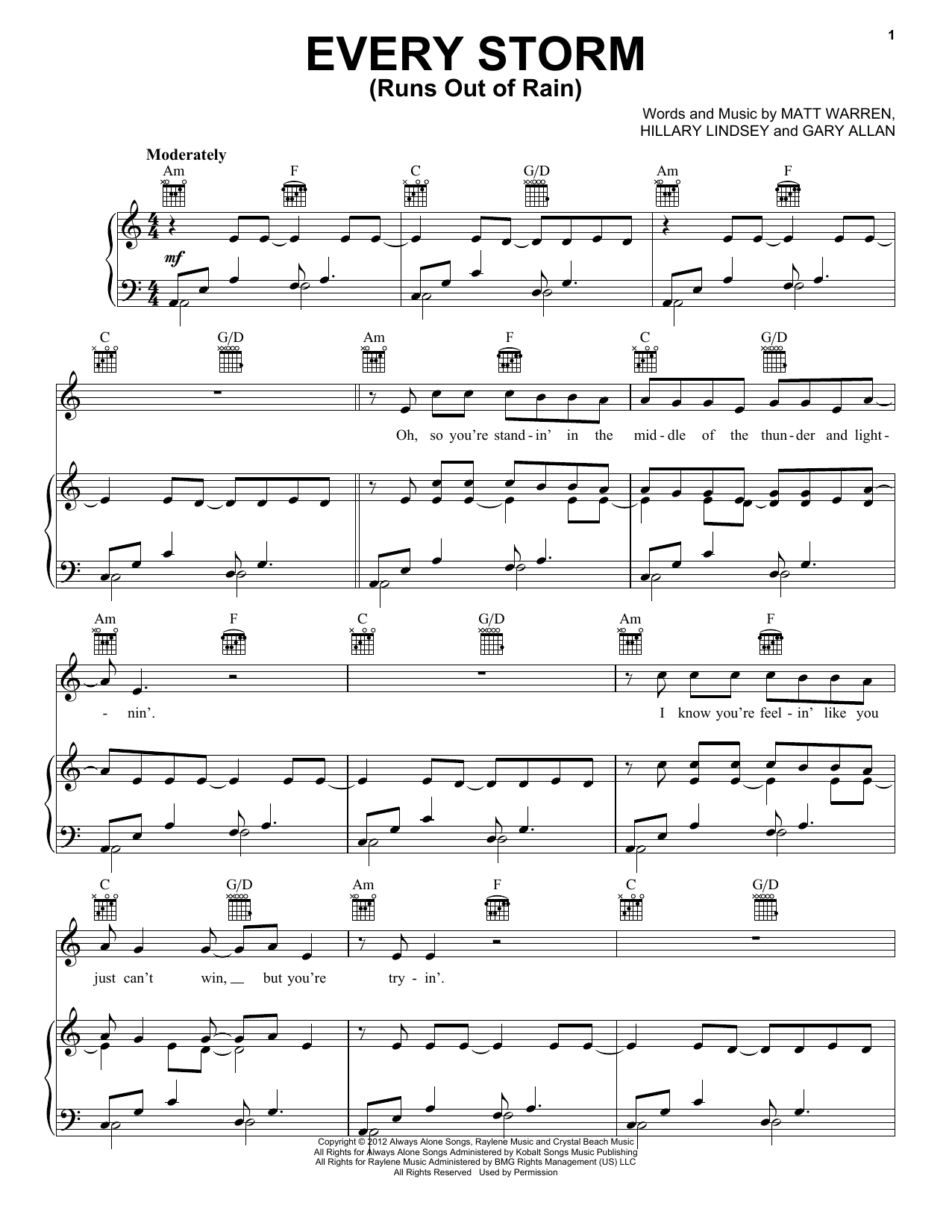 Download or print Gary Allan Every Storm (Runs Out Of Rain) sheet music, chords and digital score arranged for Easy Piano. This Pop score includes 6 page(s).