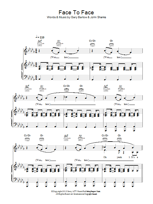 Download or print Gary Barlow Face To Face sheet music, chords and digital score arranged for Piano, Vocal & Guitar Chords. This Pop score includes 6 page(s).