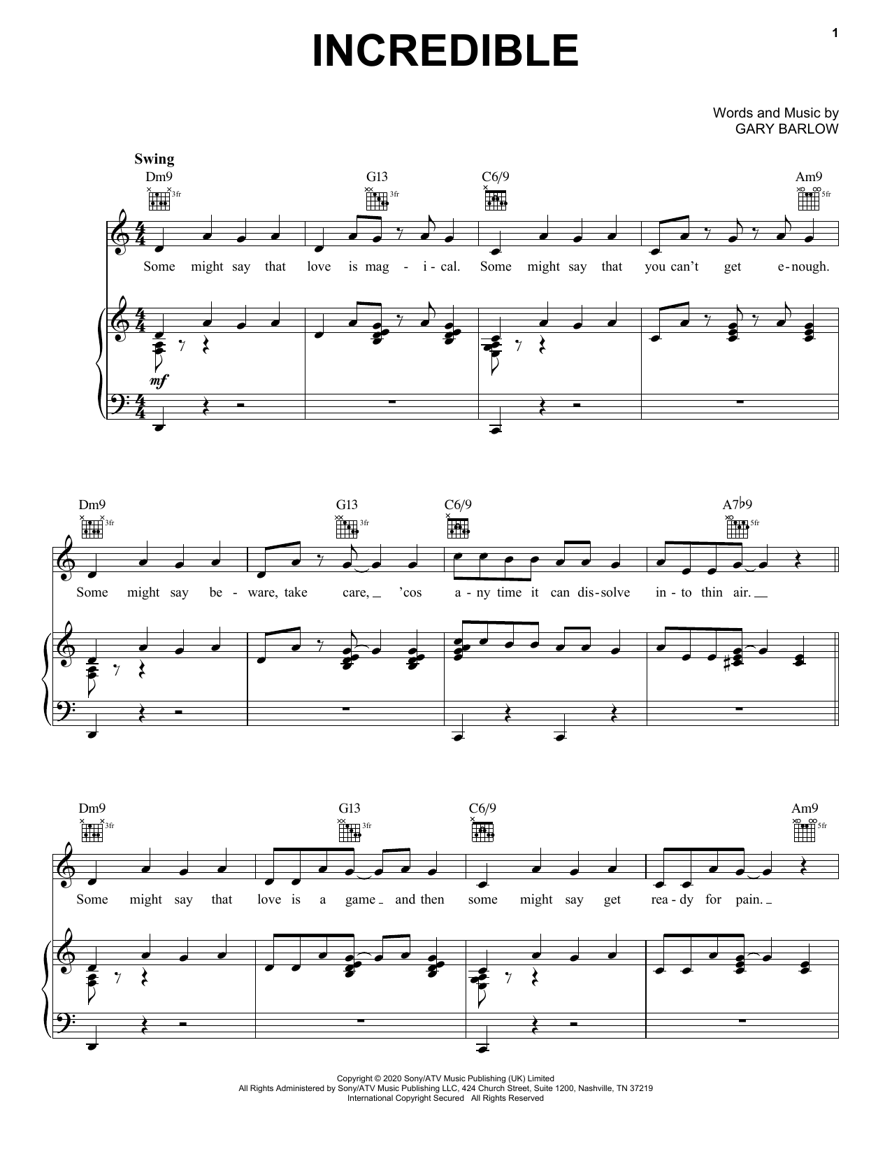 Download or print Gary Barlow Incredible sheet music, chords and digital score arranged for Piano, Vocal & Guitar Chords (Right-Hand Melody). This Pop score includes 8 page(s).