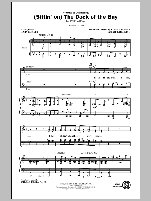 Download or print Gary Eckert (Sittin' On) The Dock Of The Bay sheet music, chords and digital score arranged for SAB Choir. This Oldies score includes 9 page(s).