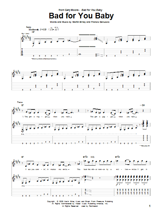 Download or print Gary Moore Bad For You Baby sheet music, chords and digital score arranged for Guitar Tab. This Pop score includes 8 page(s).