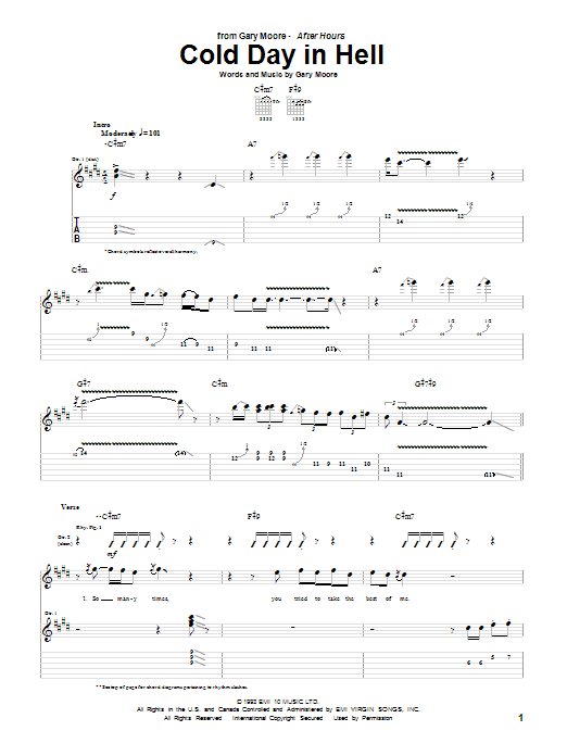 Download or print Gary Moore Cold Day In Hell sheet music, chords and digital score arranged for Guitar Tab (Single Guitar). This Blues score includes 11 page(s).