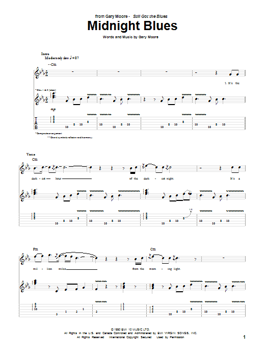 Download or print Gary Moore Midnight Blues sheet music, chords and digital score arranged for Guitar Tab (Single Guitar). This Pop score includes 7 page(s).