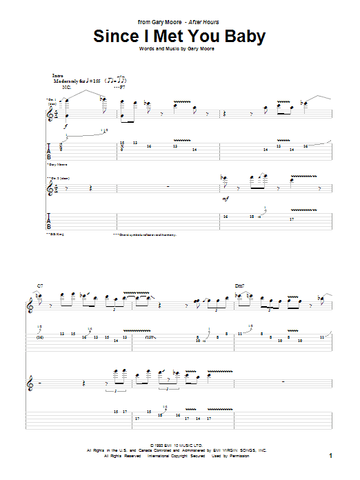 Download or print Gary Moore Since I Met You Baby sheet music, chords and digital score arranged for Guitar Tab (Single Guitar). This Blues score includes 8 page(s).