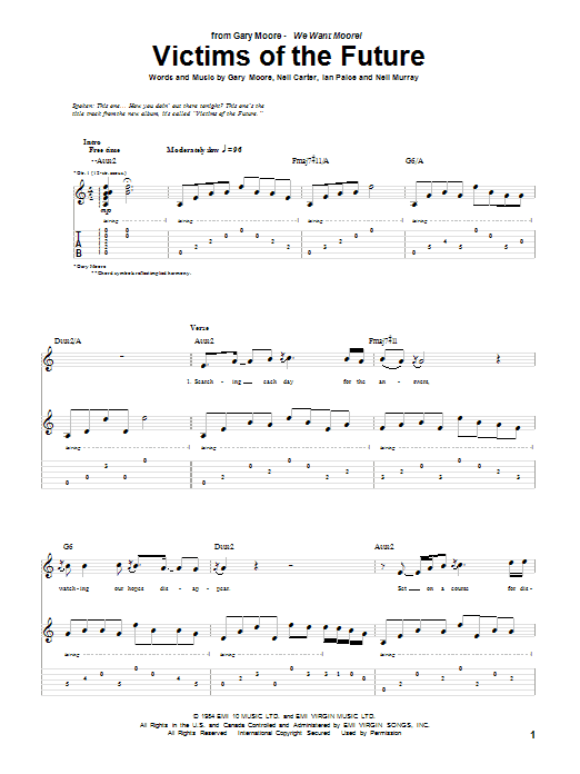 Download or print Gary Moore Victims Of The Future sheet music, chords and digital score arranged for Guitar Tab. This Pop score includes 16 page(s).