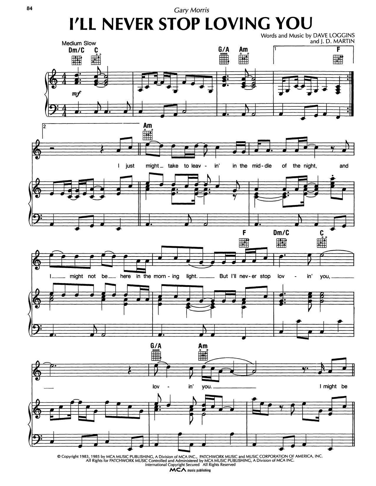 Download or print Gary Morris I'll Never Stop Loving You sheet music, chords and digital score arranged for Piano, Vocal & Guitar Chords (Right-Hand Melody). This Country score includes 4 page(s).