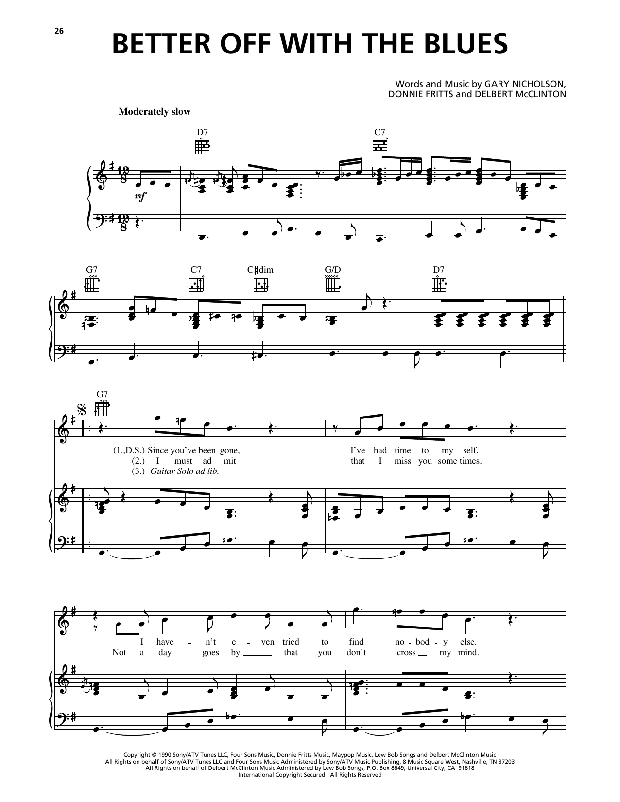 Download or print Gatemouth Brown Better Off With The Blues sheet music, chords and digital score arranged for Piano, Vocal & Guitar Chords (Right-Hand Melody). This Blues score includes 4 page(s).