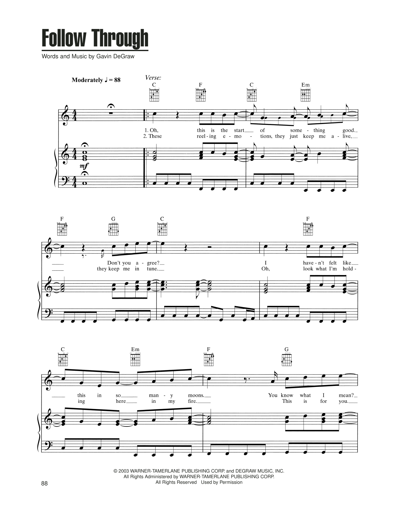 Download or print Gavin DeGraw Follow Through sheet music, chords and digital score arranged for Piano, Vocal & Guitar Chords (Right-Hand Melody). This Country score includes 6 page(s).