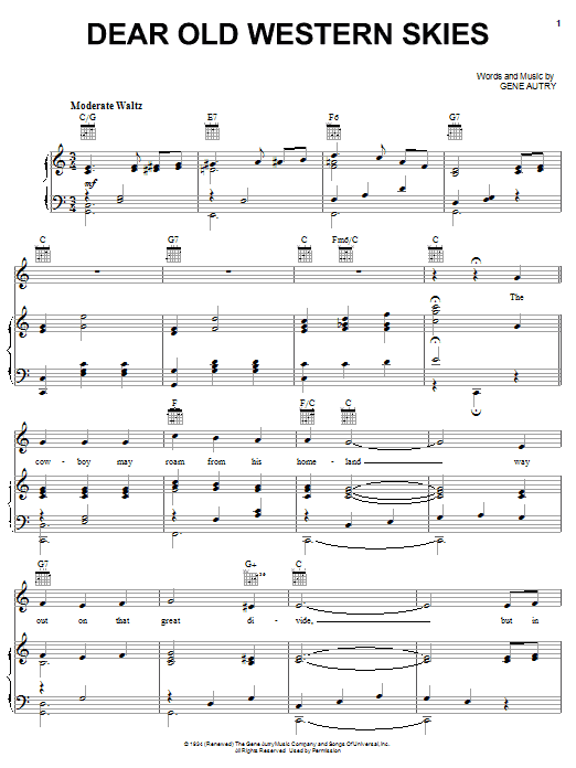 Download or print Gene Autry Dear Old Western Skies sheet music, chords and digital score arranged for Piano, Vocal & Guitar Chords (Right-Hand Melody). This Country score includes 3 page(s).