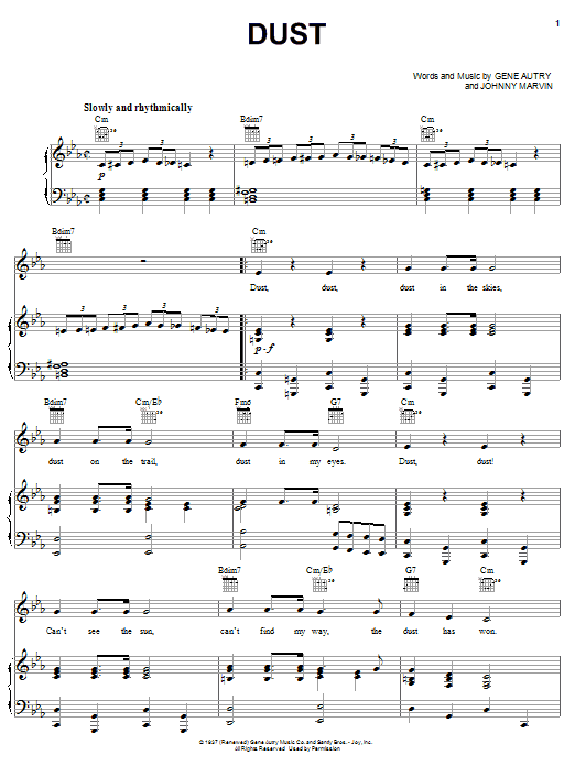 Download or print Gene Autry Dust sheet music, chords and digital score arranged for Piano, Vocal & Guitar Chords (Right-Hand Melody). This Country score includes 3 page(s).
