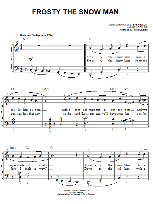 Download or print Gene Autry Frosty The Snow Man [Jazz version] (arr. Phillip Keveren) sheet music, chords and digital score arranged for Easy Piano. This Children score includes 3 page(s).