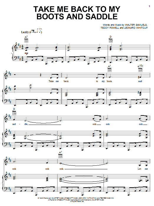 Download or print Gene Autry Take Me Back To My Boots And Saddle sheet music, chords and digital score arranged for Piano, Vocal & Guitar Chords (Right-Hand Melody). This Country score includes 4 page(s).