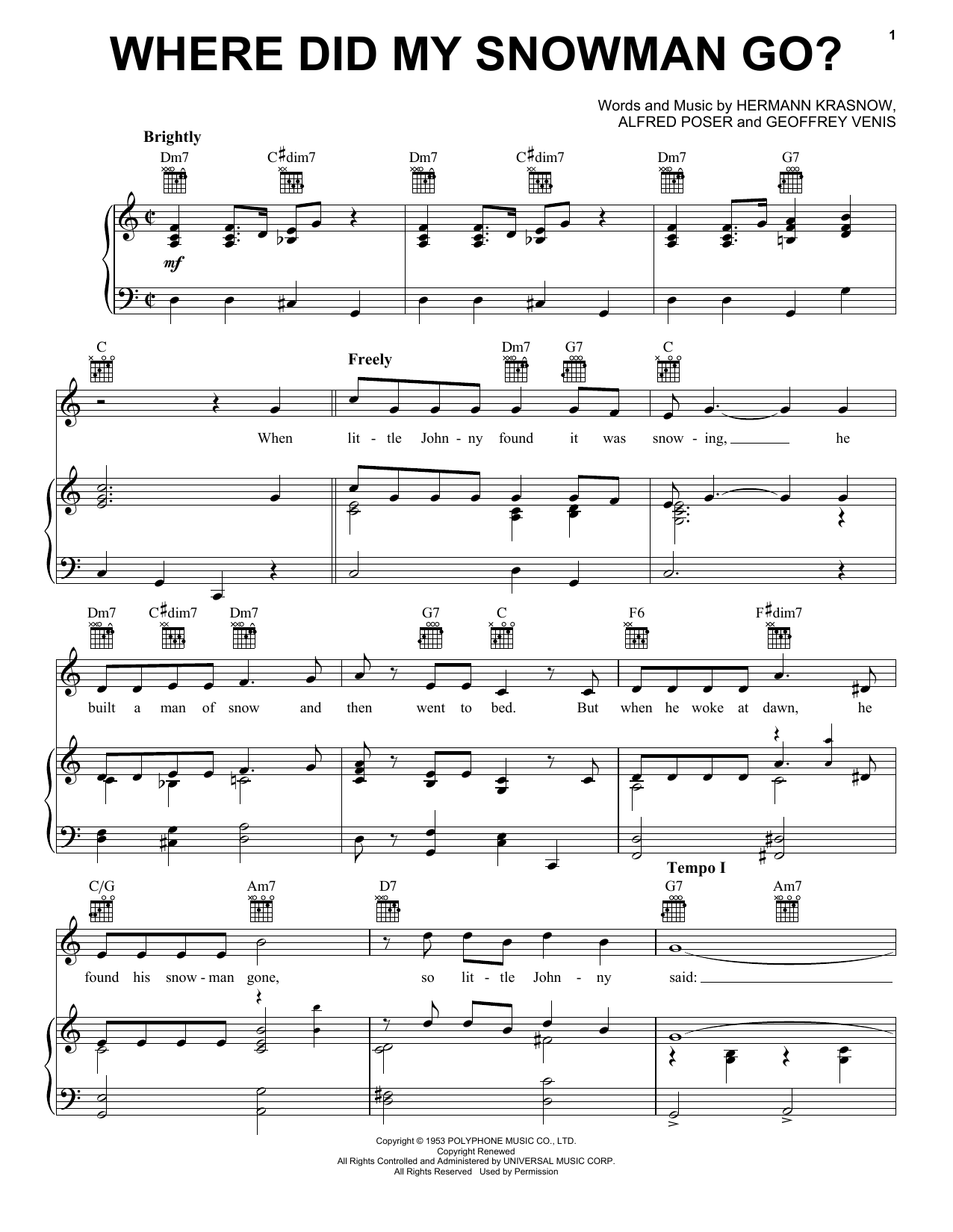 Download or print Gene Autry Where Did My Snowman Go? sheet music, chords and digital score arranged for Piano, Vocal & Guitar Chords (Right-Hand Melody). This Christmas score includes 4 page(s).