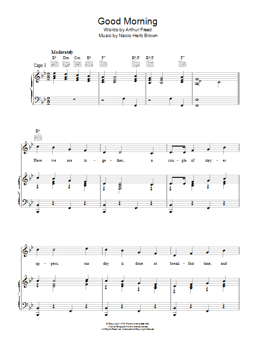 Download or print Gene Kelly Good Morning sheet music, chords and digital score arranged for Piano, Vocal & Guitar Chords. This Standards score includes 5 page(s).