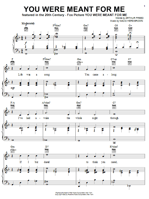 Download or print Gene Kelly You Were Meant For Me sheet music, chords and digital score arranged for Piano, Vocal & Guitar Chords (Right-Hand Melody). This Film/TV score includes 4 page(s).