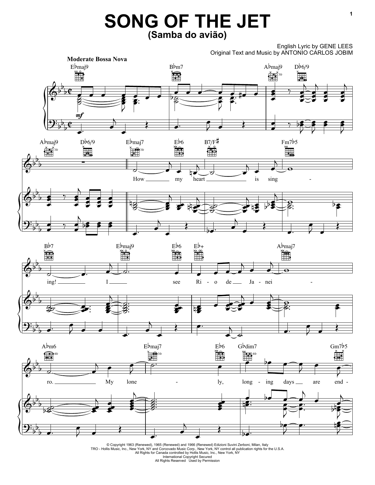 Download or print Gene Lees Song Of The Jet (Samba do Aviao) sheet music, chords and digital score arranged for Piano, Vocal & Guitar Chords (Right-Hand Melody). This Jazz score includes 4 page(s).