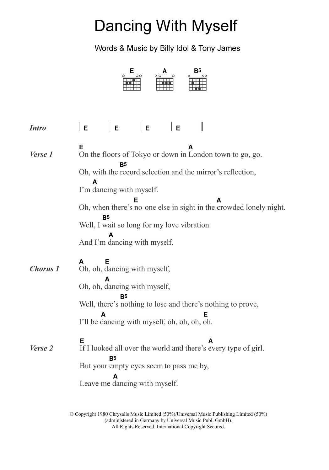Download or print Generation X Dancing With Myself sheet music, chords and digital score arranged for Piano Chords/Lyrics. This Punk score includes 3 page(s).