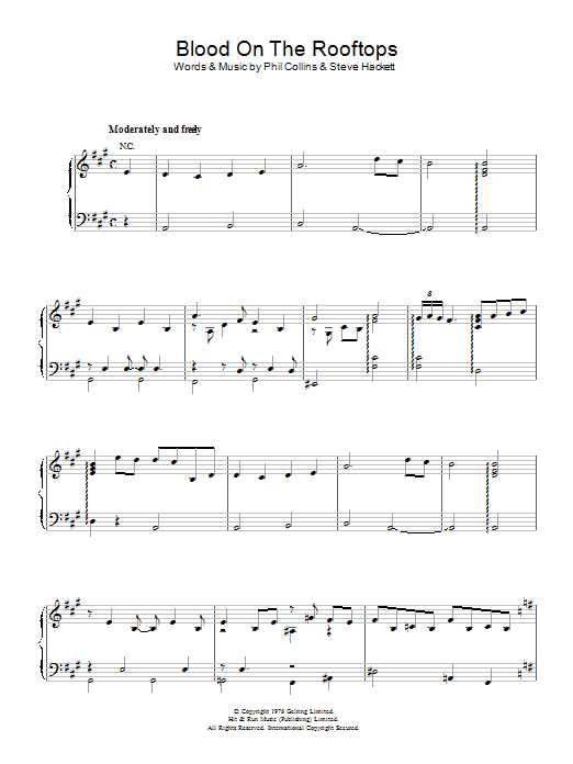 Download or print Genesis Blood On The Rooftops sheet music, chords and digital score arranged for Piano, Vocal & Guitar Chords. This Pop score includes 9 page(s).