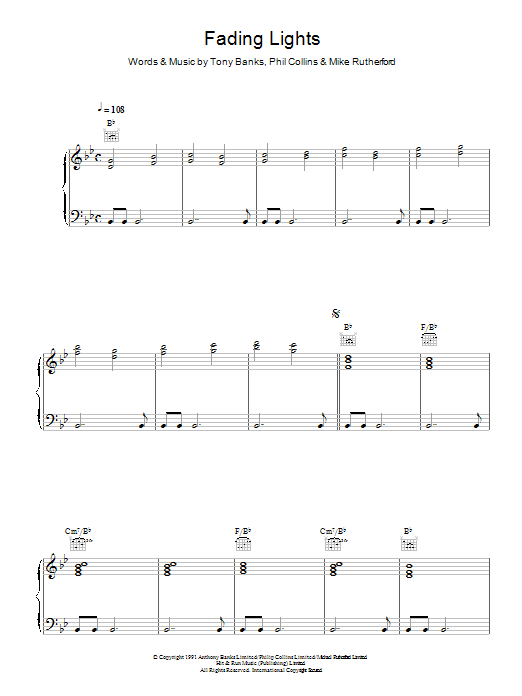 Download or print Genesis Fading Lights sheet music, chords and digital score arranged for Piano, Vocal & Guitar Chords (Right-Hand Melody). This Rock score includes 4 page(s).