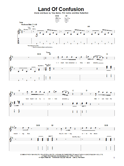 Download or print Genesis Land Of Confusion sheet music, chords and digital score arranged for Guitar Tab. This Pop score includes 5 page(s).