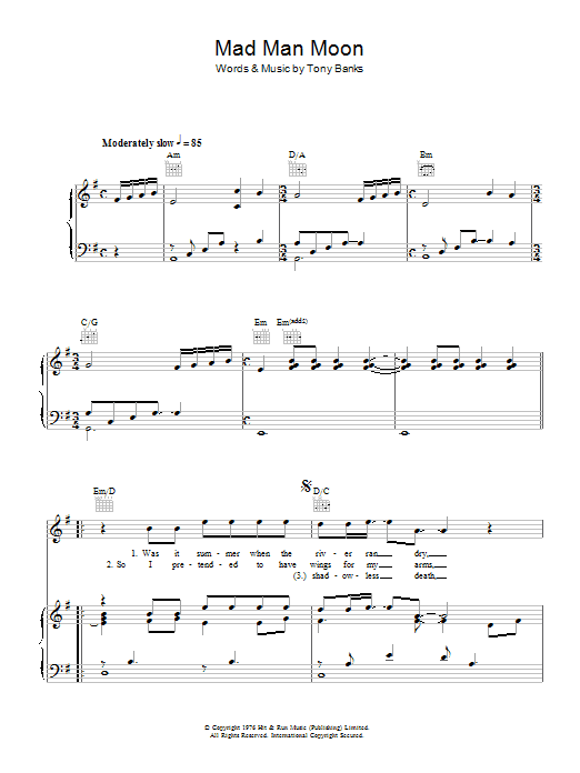Download or print Genesis Mad Man Moon sheet music, chords and digital score arranged for Piano, Vocal & Guitar Chords (Right-Hand Melody). This Rock score includes 7 page(s).