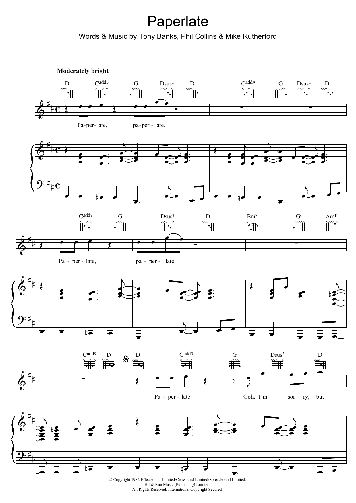 Download or print Genesis Paperlate sheet music, chords and digital score arranged for Piano, Vocal & Guitar Chords (Right-Hand Melody). This Rock score includes 5 page(s).