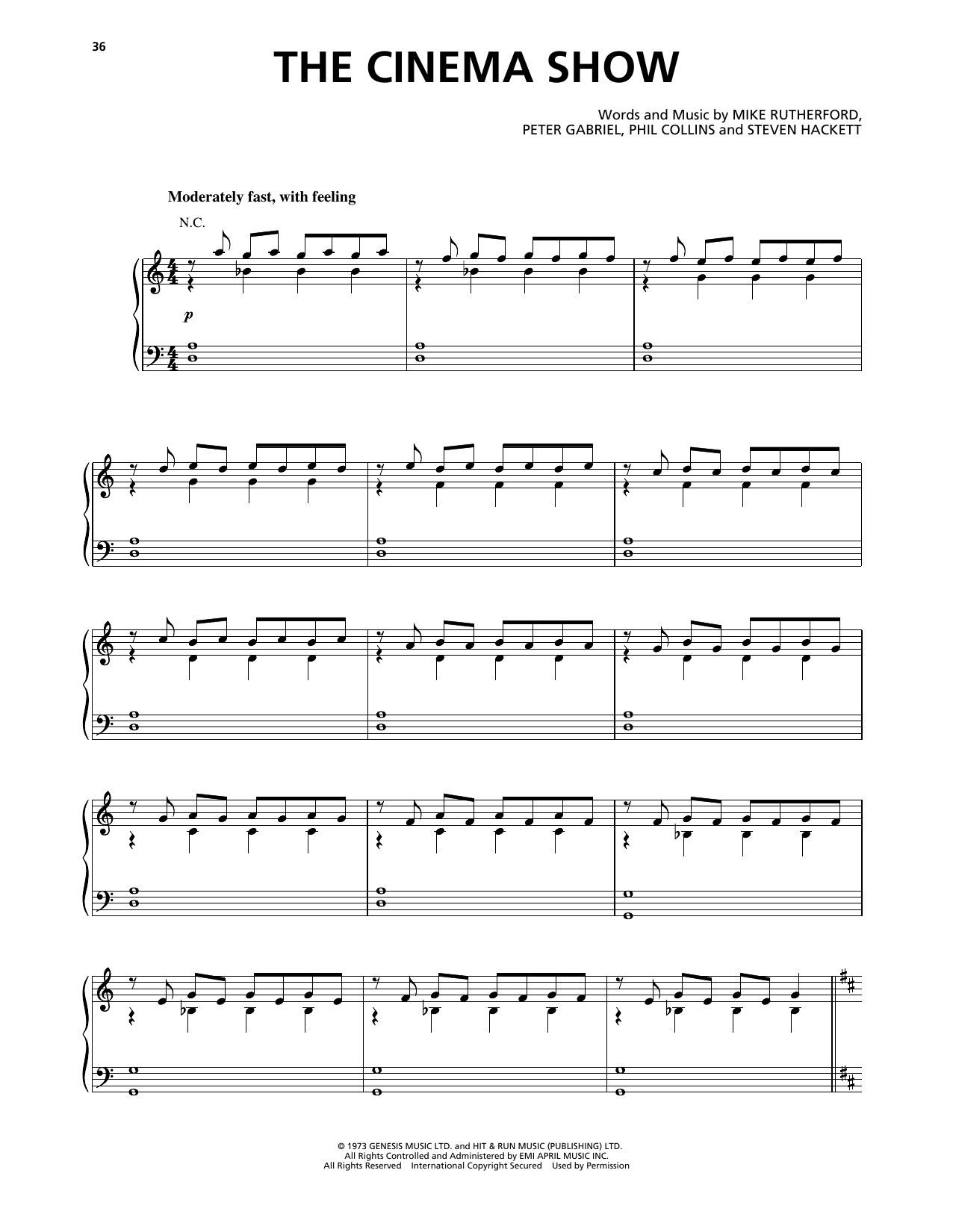 Download or print Genesis The Cinema Show sheet music, chords and digital score arranged for Piano, Vocal & Guitar Chords (Right-Hand Melody). This Rock score includes 10 page(s).