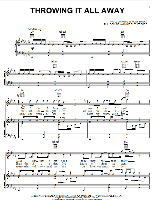 Download or print Genesis Throwing It All Away sheet music, chords and digital score arranged for Keyboard Transcription. This Pop score includes 14 page(s).