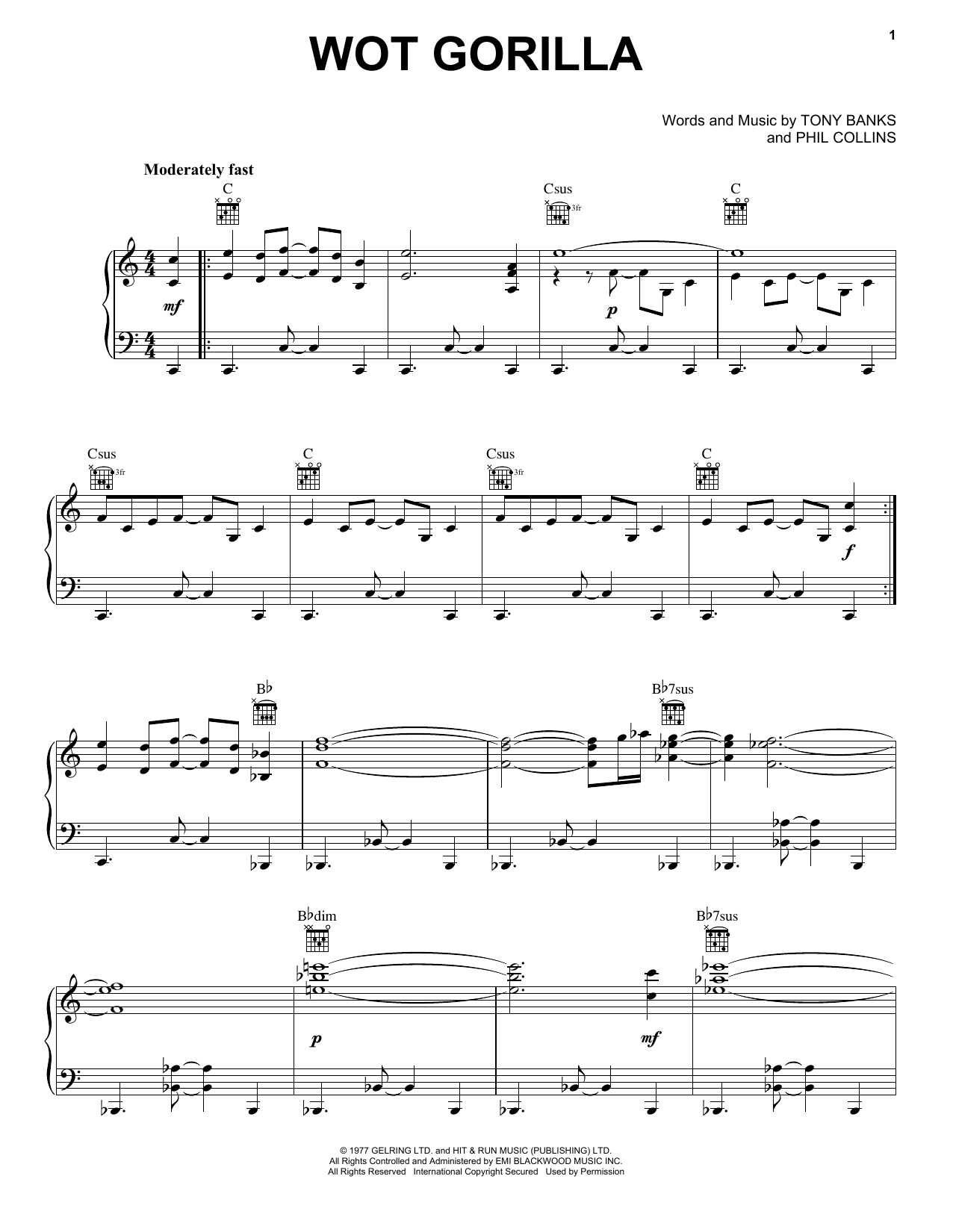 Download or print Genesis Wot Gorilla sheet music, chords and digital score arranged for Piano Solo. This Rock score includes 4 page(s).