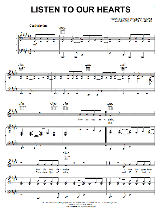 Download or print Geoff Moore & The Distance Listen To Our Hearts sheet music, chords and digital score arranged for Piano Solo. This Christian score includes 5 page(s).