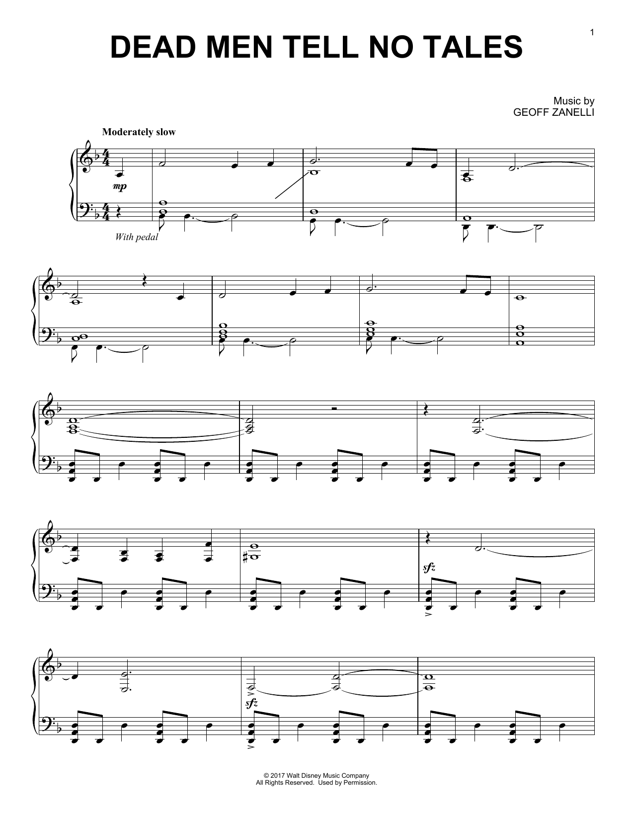 Download or print Geoff Zanelli Dead Men Tell No Tales sheet music, chords and digital score arranged for Piano Solo. This Disney score includes 2 page(s).