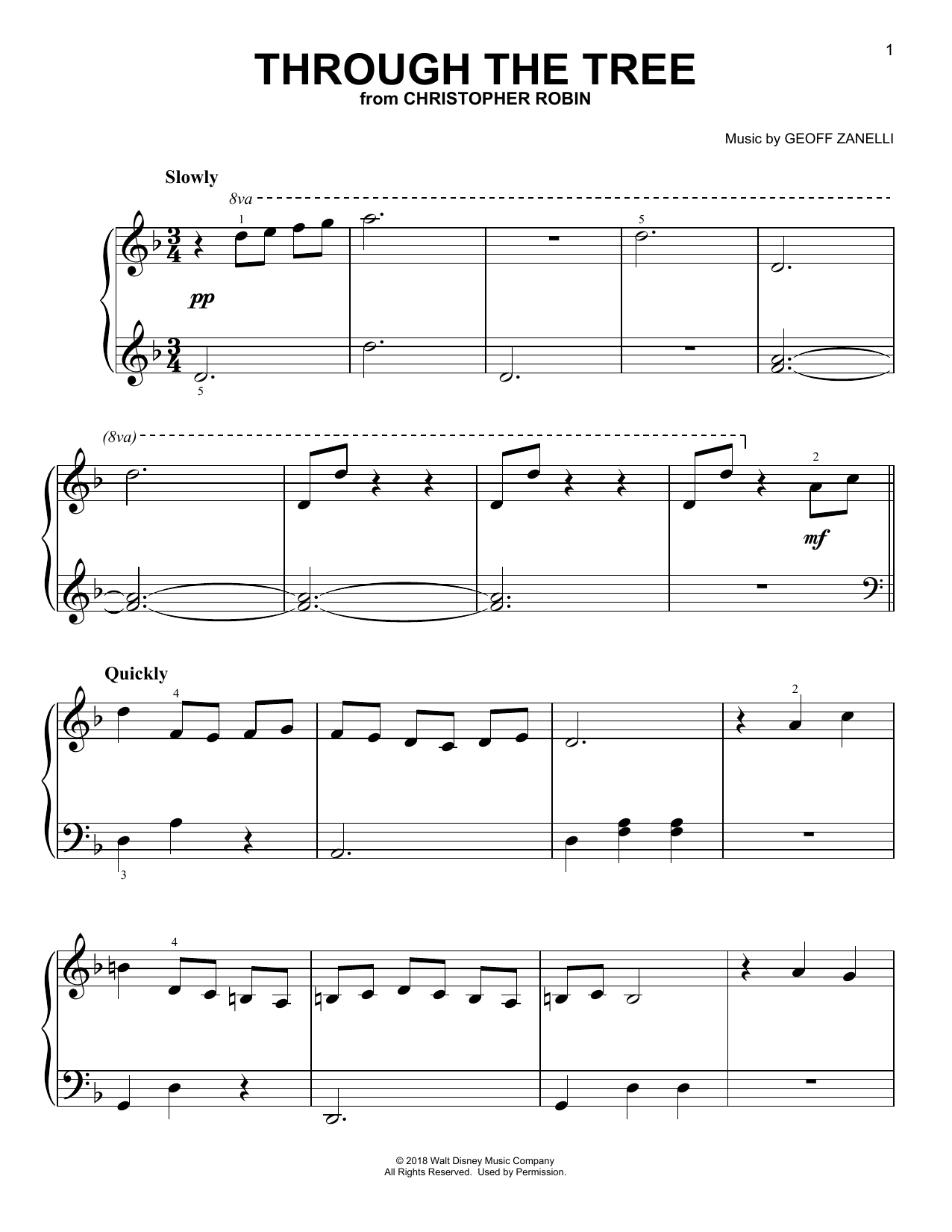 Download or print Geoff Zanelli & Jon Brion Through The Tree (from Christopher Robin) sheet music, chords and digital score arranged for Easy Piano. This Children score includes 5 page(s).