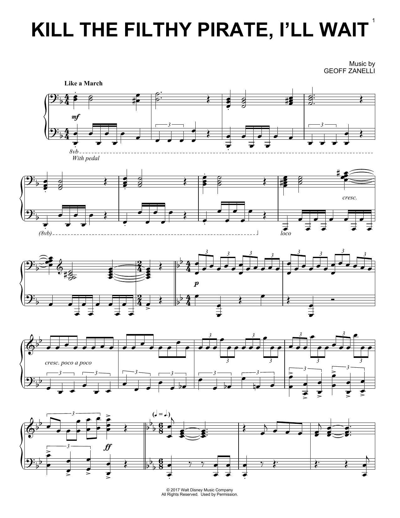 Download or print Geoff Zanelli Kill The Filthy Pirate, I'll Wait sheet music, chords and digital score arranged for Piano Solo. This Disney score includes 6 page(s).