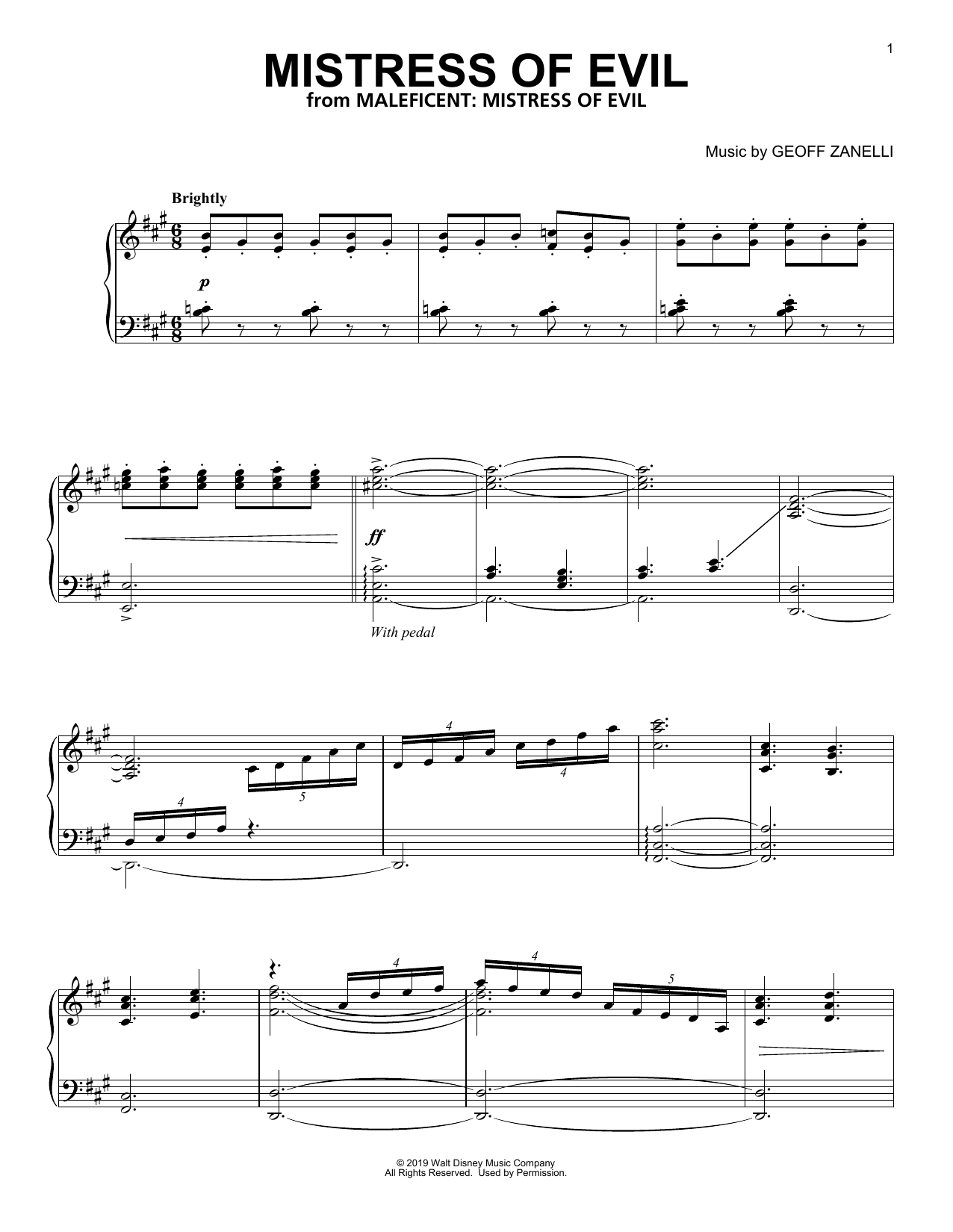 Download or print Geoff Zanelli Mistress Of Evil (from Disney's Maleficent: Mistress of Evil) sheet music, chords and digital score arranged for Piano Solo. This Disney score includes 3 page(s).