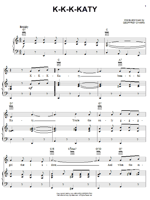 Download or print Geoffrey O'Hara K-K-K-Katy sheet music, chords and digital score arranged for Piano, Vocal & Guitar Chords (Right-Hand Melody). This Musical/Show score includes 3 page(s).