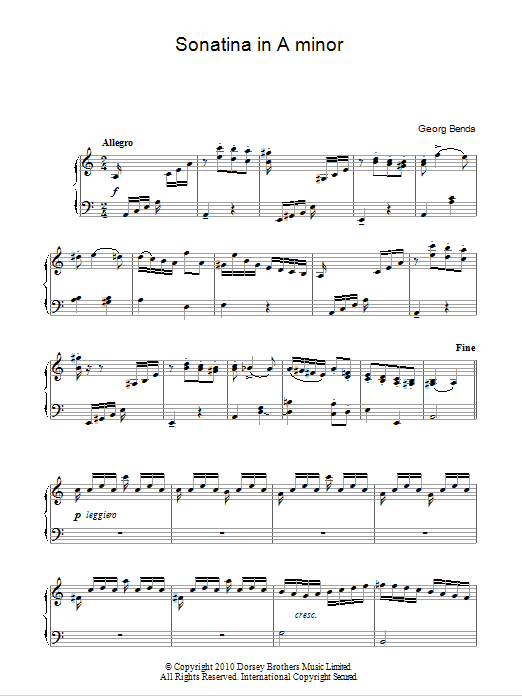 Download or print Georg Benda Sonatina In A Minor sheet music, chords and digital score arranged for Piano Solo. This Classical score includes 2 page(s).