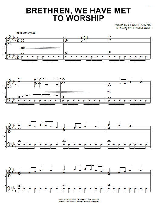 Download or print George Atkins Brethren, We Have Met To Worship sheet music, chords and digital score arranged for Piano Solo. This Inspirational score includes 4 page(s).