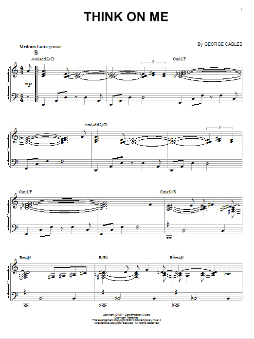 Download or print George Cables Think On Me (arr. Brent Edstrom) sheet music, chords and digital score arranged for Piano Solo. This Jazz score includes 4 page(s).
