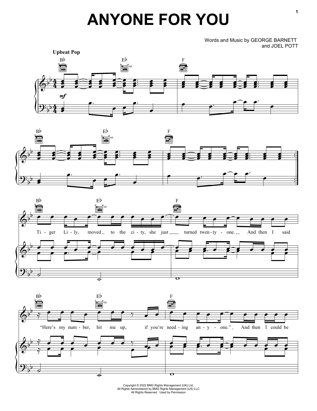 Download or print George Ezra Anyone For You (Tiger Lily) sheet music, chords and digital score arranged for Piano, Vocal & Guitar Chords (Right-Hand Melody). This Folk score includes 7 page(s).