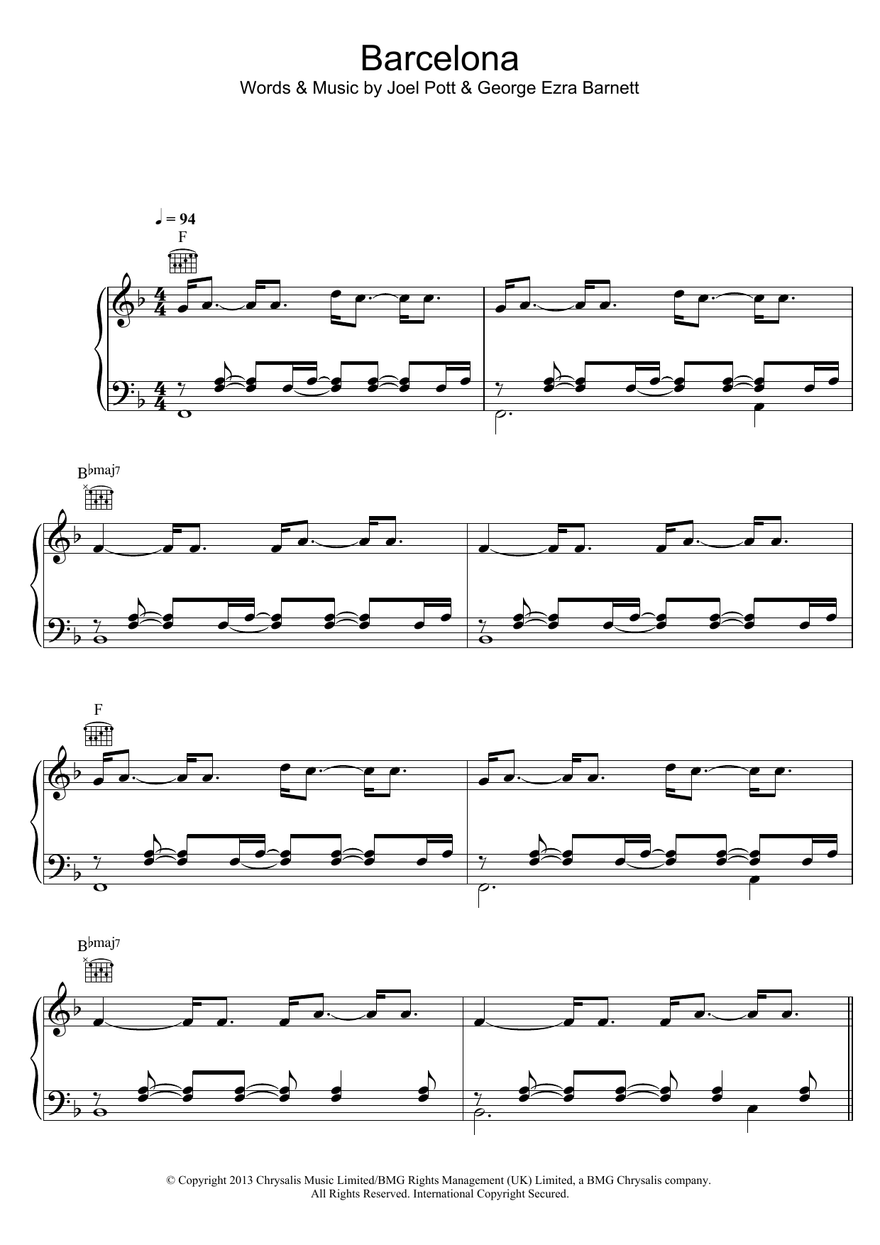 Download or print George Ezra Barcelona sheet music, chords and digital score arranged for Piano, Vocal & Guitar Chords. This Folk score includes 6 page(s).