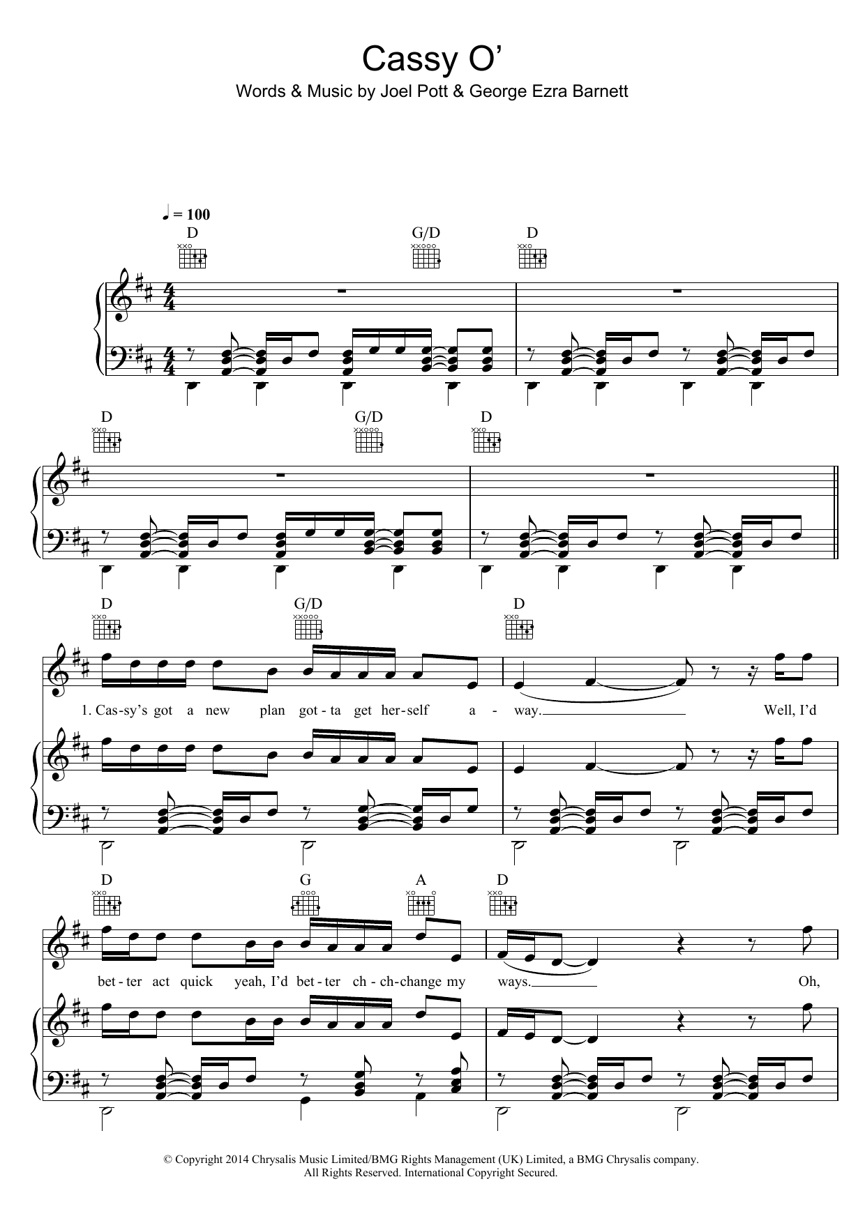Download or print George Ezra Cassy O' sheet music, chords and digital score arranged for Piano, Vocal & Guitar Chords. This Folk score includes 5 page(s).