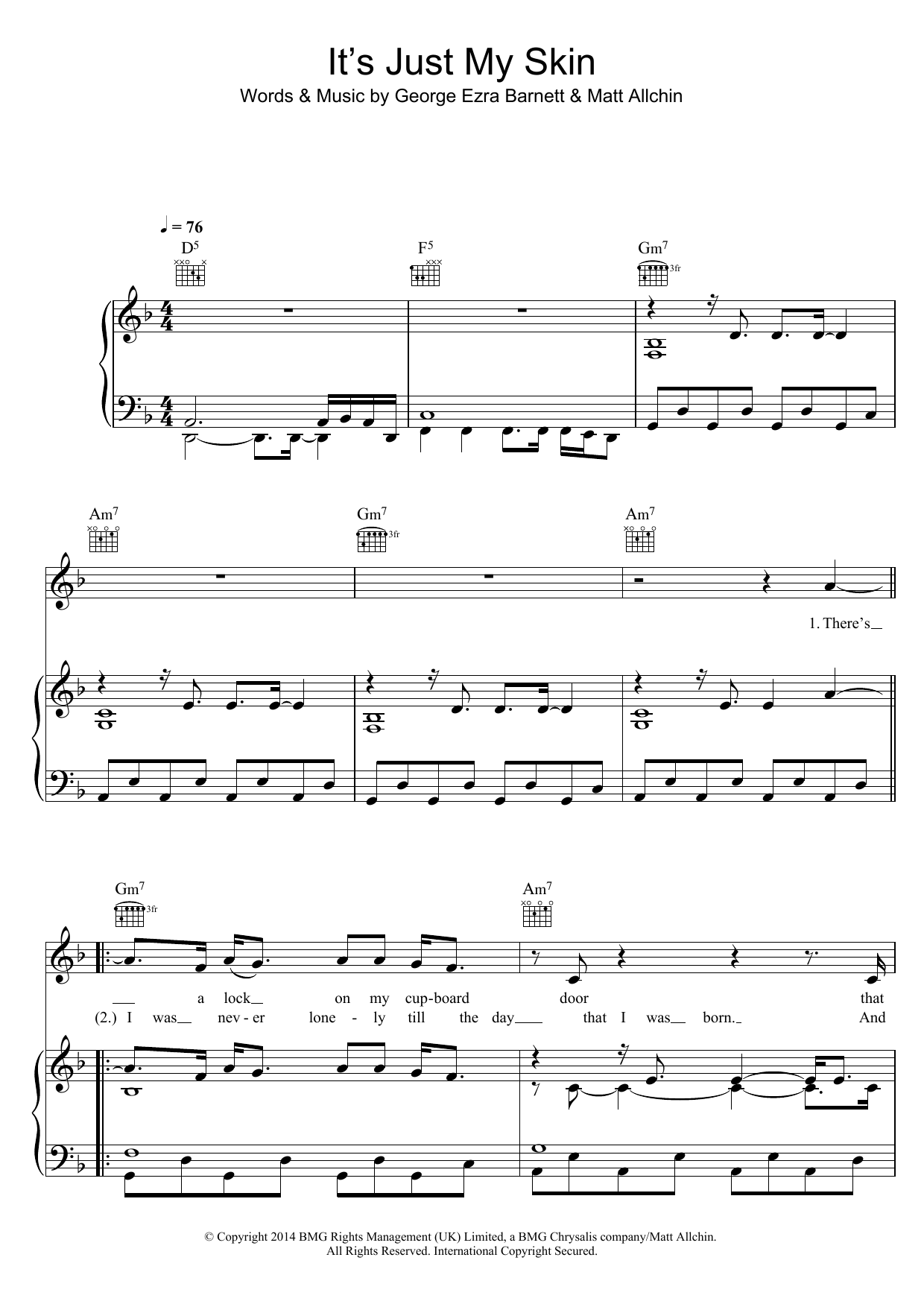 Download or print George Ezra It's Just My Skin sheet music, chords and digital score arranged for Piano, Vocal & Guitar Chords. This Folk score includes 5 page(s).