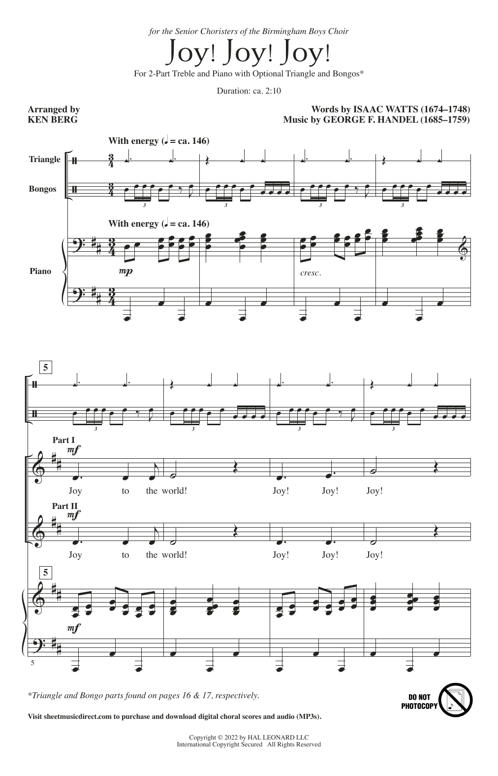 Download or print George F. Handel Joy! Joy! Joy! (arr. Ken Berg) sheet music, chords and digital score arranged for 2-Part Choir. This Christmas score includes 17 page(s).