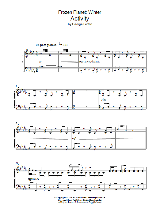 Download or print George Fenton Frozen Planet, Activity sheet music, chords and digital score arranged for Piano Solo. This Film/TV score includes 3 page(s).