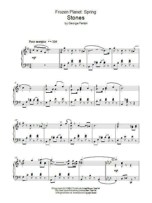 Download or print George Fenton Frozen Planet, Stones sheet music, chords and digital score arranged for Piano Solo. This Film/TV score includes 4 page(s).