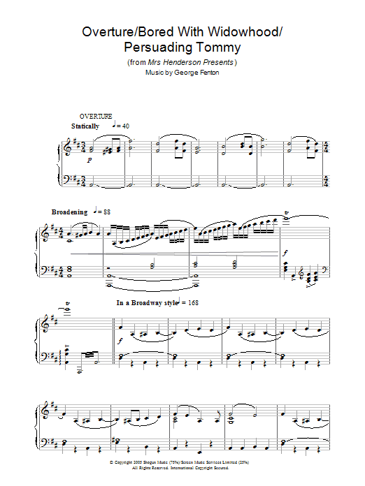 Download or print George Fenton Overture/Bored With Widowhood/Persuading Tommy (from Mrs Henderson Presents) sheet music, chords and digital score arranged for Piano Solo. This Film/TV score includes 8 page(s).