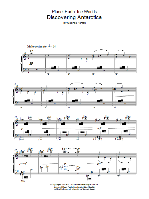 Download or print George Fenton Planet Earth: Discovering Antarctica sheet music, chords and digital score arranged for Piano Solo. This Film/TV score includes 4 page(s).
