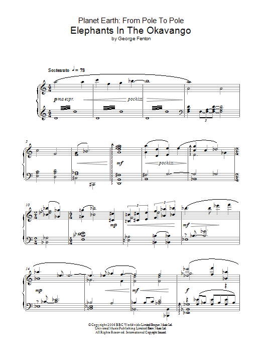 Download or print George Fenton Planet Earth: Elephants in the Okavango sheet music, chords and digital score arranged for Piano Solo. This Film/TV score includes 4 page(s).