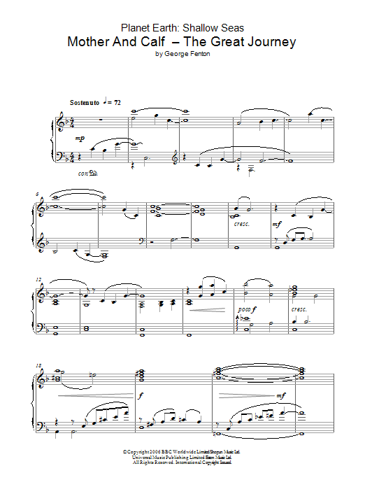 Download or print George Fenton Planet Earth: Mother And Calf - The Great Journey sheet music, chords and digital score arranged for Piano Solo. This Film/TV score includes 6 page(s).